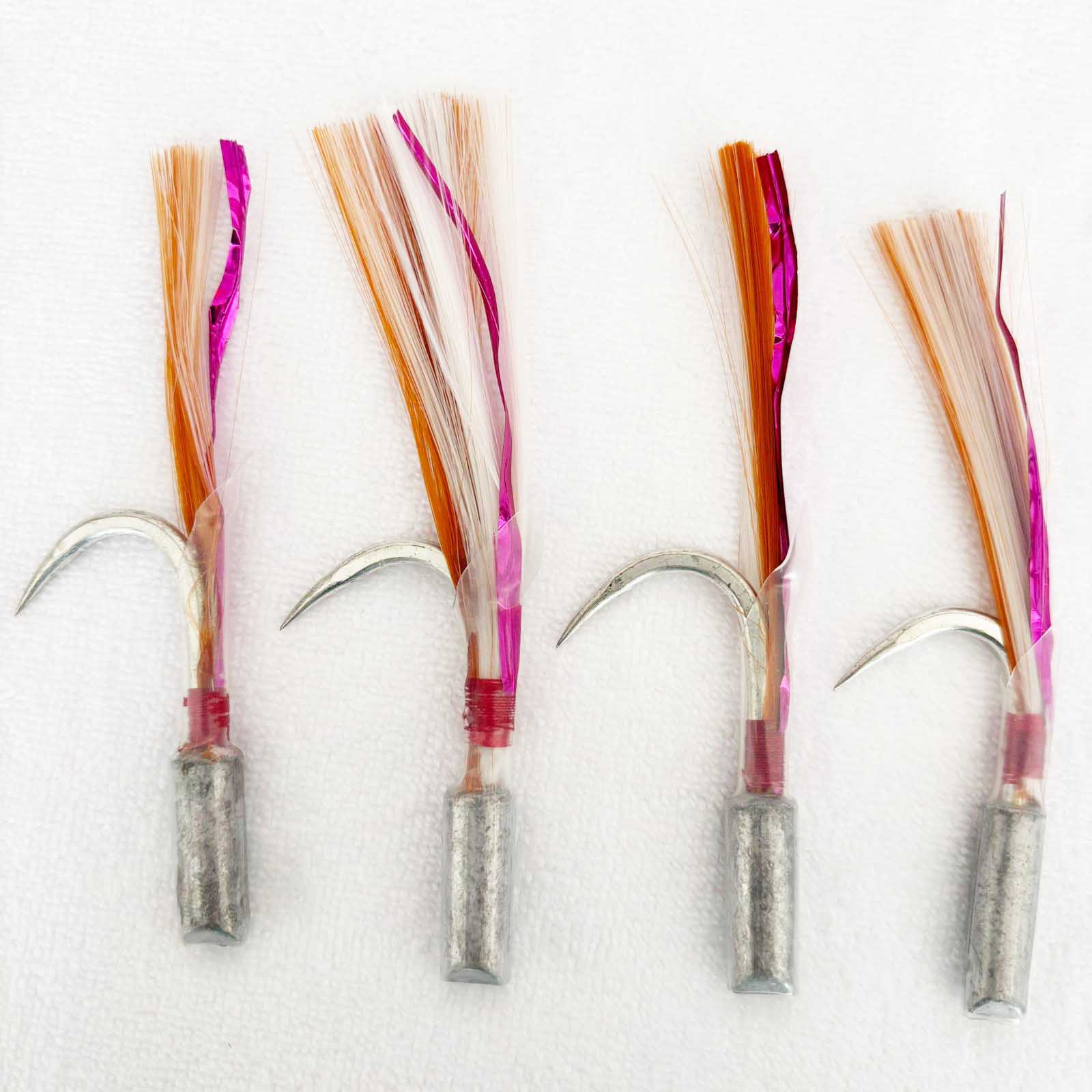 These skirted hooks feature vibrant orange, white, and pink reflective fibers that shimmer underwater